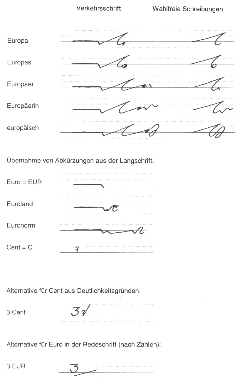 wahlfreie Schreibungen für Europa, Euro, Cent in der Verkehrsschrift der